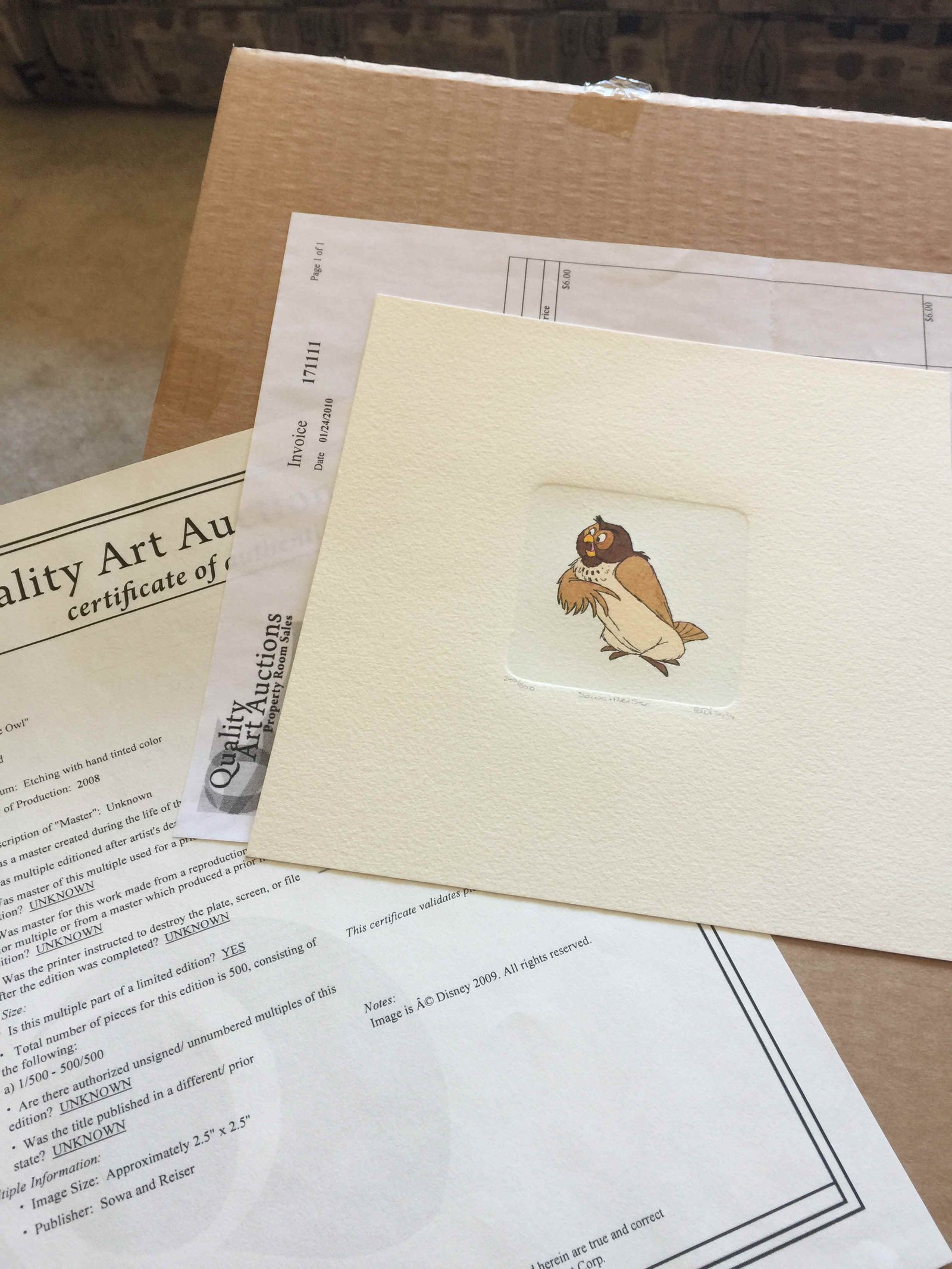 3. Owl Etching with hand tinted color 2008 Disney  Hand tinted Etching COA Sowa and Reiser.