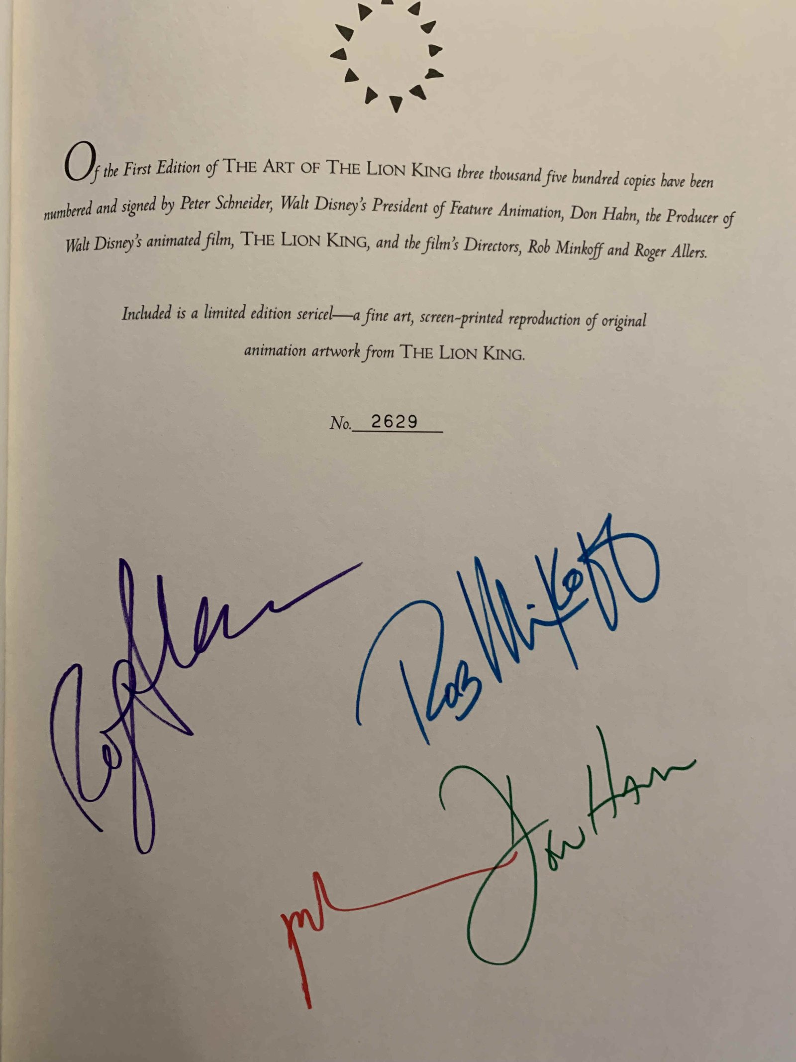 The Art Of The Lion King Text by Christopher Finch ONLY 3500 copies signed by Director Peter Schneider  Animation President Don Habn, Producer and Director Rob Minkoff and Roger Allers